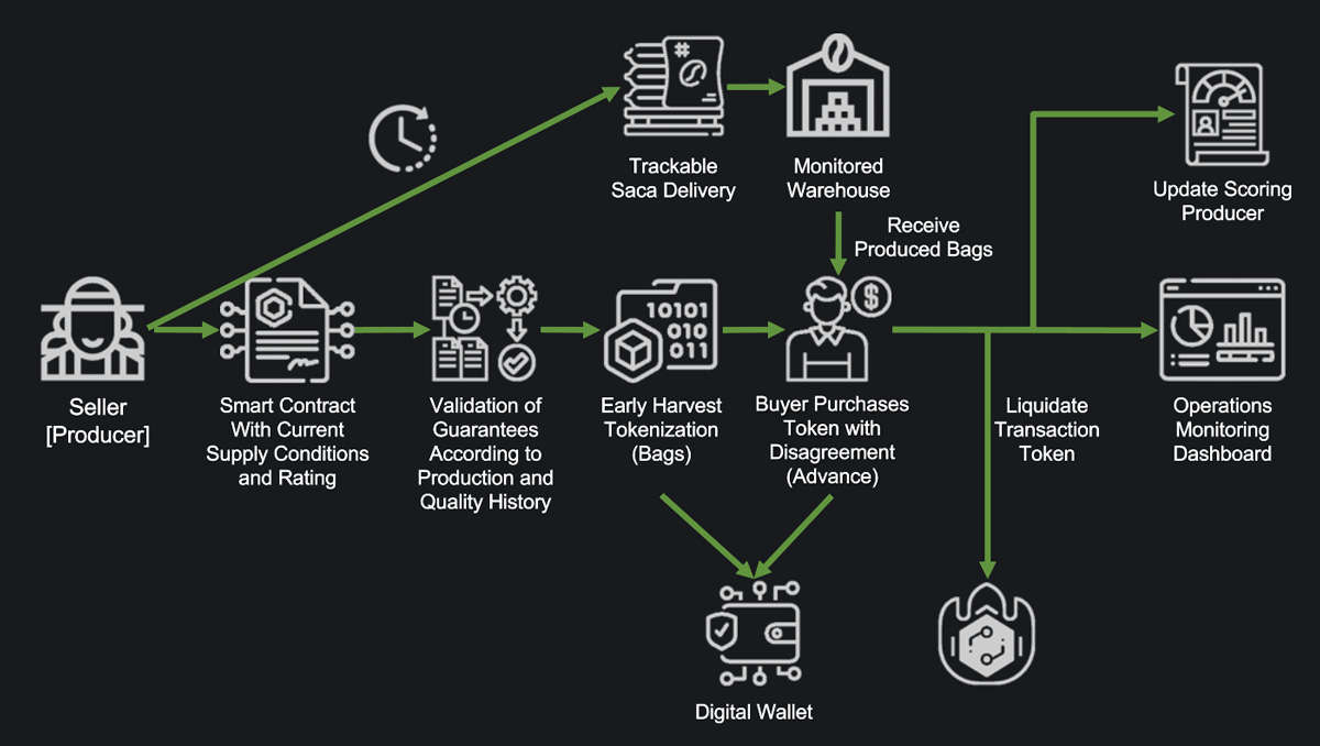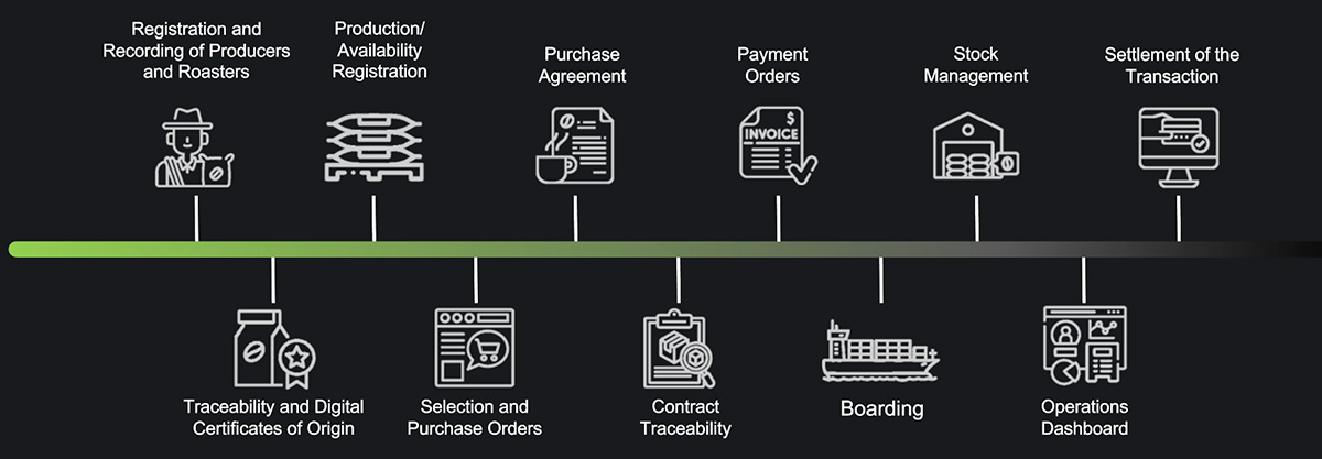 The cooperative's coffee marketing platform monitors production, inventory and sales, traceable via blockchain, recording each event in the coffee's life cycle, as well as certificates and reports on its designation of origin.